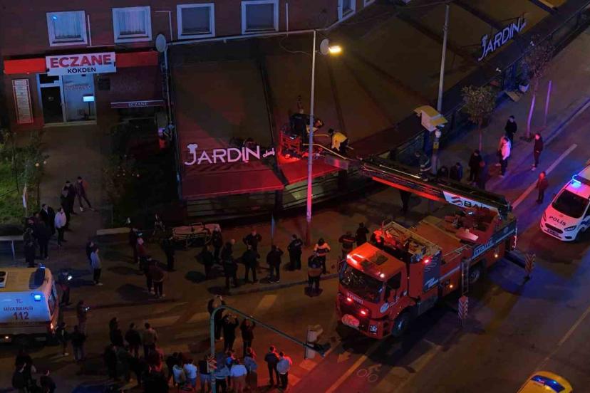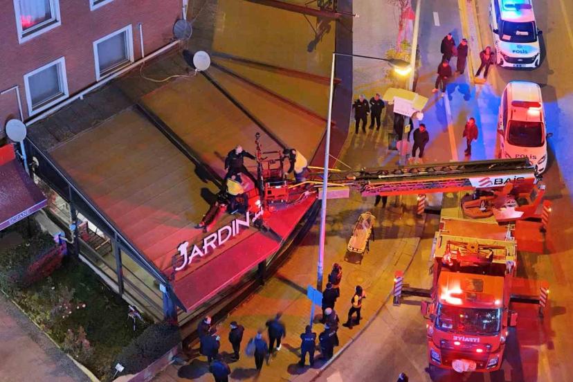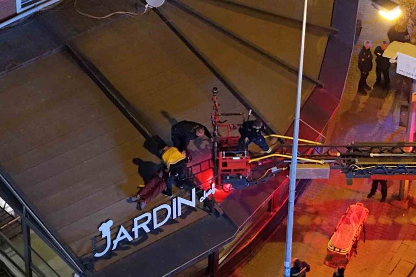 2’nci kattan kafenin tentesine düşen şahsı itfaiye aşağıya indirdi