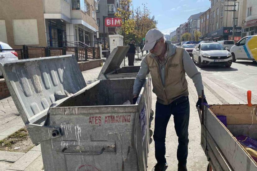 Eskişehir’de üzerinde ‘Ekmek Teknesi’ yazan el arabası ile geri dönüşüm işçiliği yapan 68 yaşındaki Mustafa Uludağ, her gün saatlerce atık malzeme topluyor.