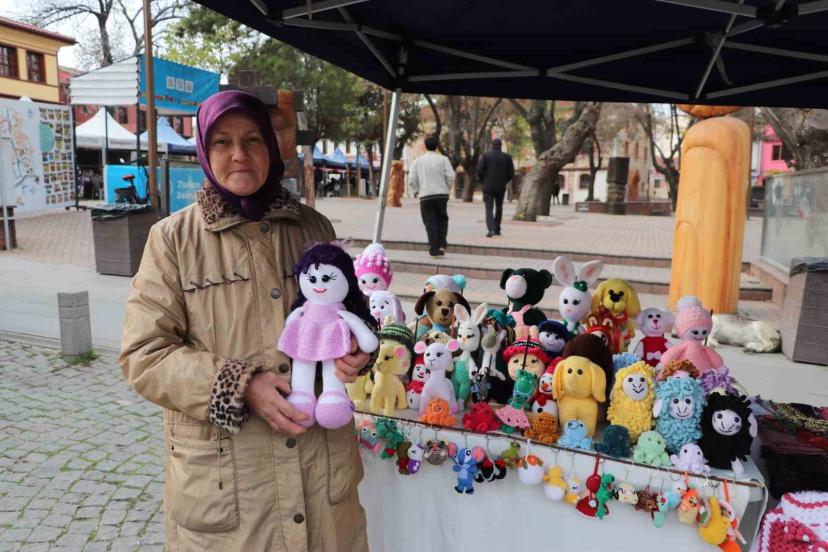 5 yıldır örgü bebek yapan 58 yaşındaki Nazmiye Köymen, hem kendi hayal gücünü kullanarak hem de internetten ilham alarak ilginç bebekler örüyor. Birbirinden farklı örgü bebekler, Tarihi Odunpazarı Evleri Bölgesi’nde satışa sunuluyor. El emeği göz nuru ürünleri ile kendisine yeni bir gelir kapısı aralayan Köymen, aynı zamanda aile ekonomisine katkıda bulunuyor. Köymen, tezgahına gelen yabancı turistlerle çeviri uygulaması kullanarak iletişim kuruyor.