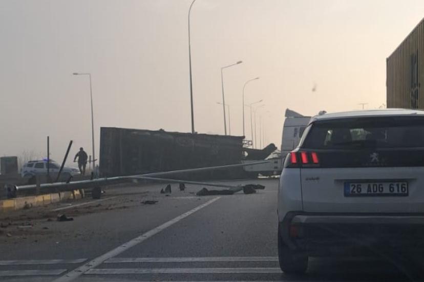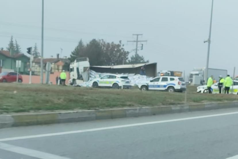 Eskişehir-Bursa karayolu üzerinde Eskişehir istikametinde ilerleyen tır, Tepebaşı ilçesi Yukarı Söğütönü Mahallesi mevkiinde refüjde sürçüşünün direksiyon hakimiyetini kaybetmesi sonucu, önce banketlere çıkması sonrası bir aydınlatma direğini devirip kavşakta yan yattı. Yan yatan ve dorsesindeki yükü kavşağa yıkılan tır trafiği olumsuz etkiledi. Olay yerine polis ve Karayolları ekipleri sevk edildi.